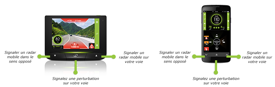 | Radars fixes | Radars mobiles, signalés en temps réel par la Communauté. |
